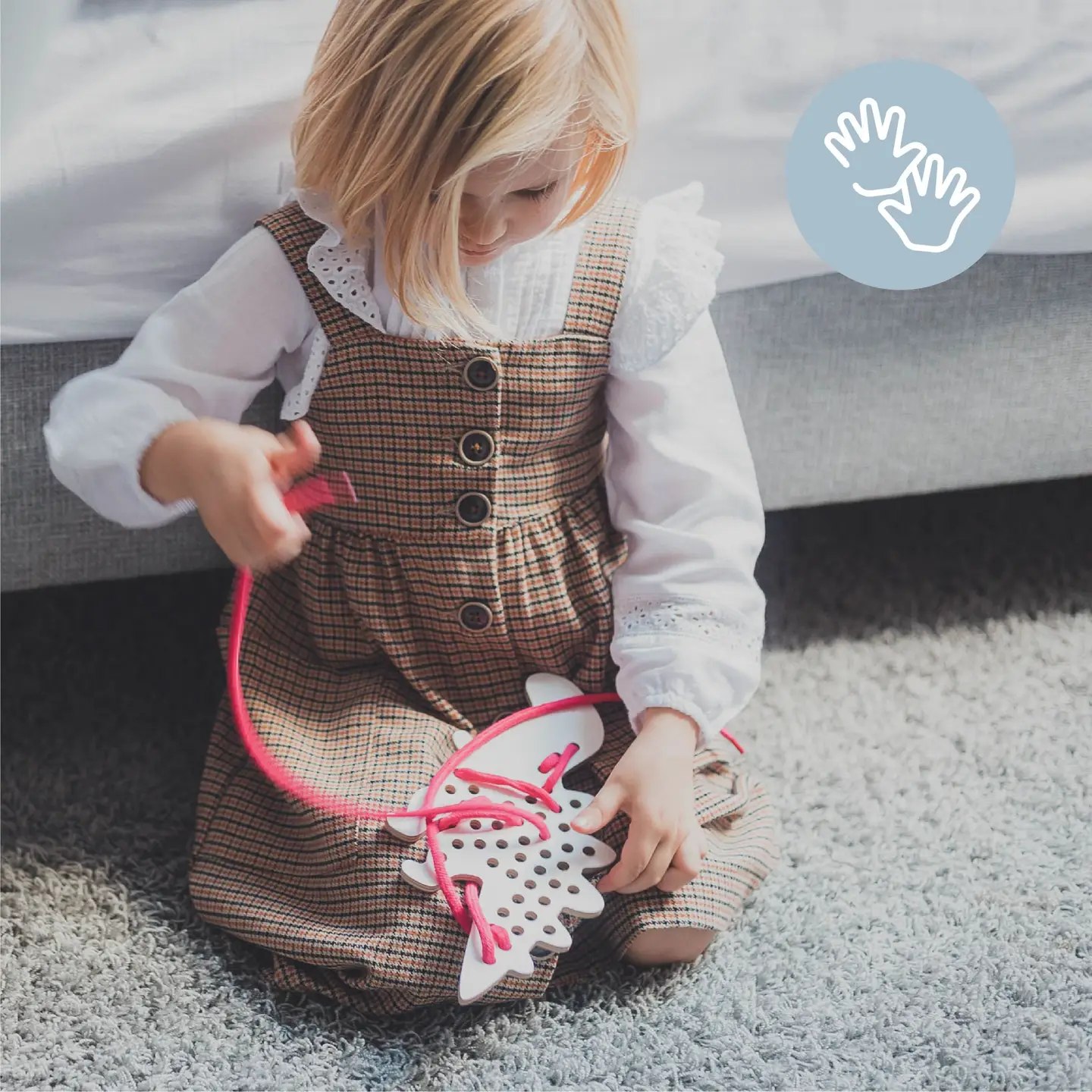 Das süße Schnürspielzeug der Marke „Milin“ fördert die Fantasie, Kreativität und Feinmotorik deines Kindes. Der Dino passt gut in eine Tasche und kann so überall mitgenommen werden. Das Set beinhaltet einen Schnürsenkel in einer zufälligen Pastellfarbe. So kann dein Kind gleich mit dem Einfädeln loslegen. Es werden ausschließlich umweltfreundliche, sichere und hochwertige Materialien verwendet. Kleinere Schnürtiere findest du ebenfalls hier im Shop.